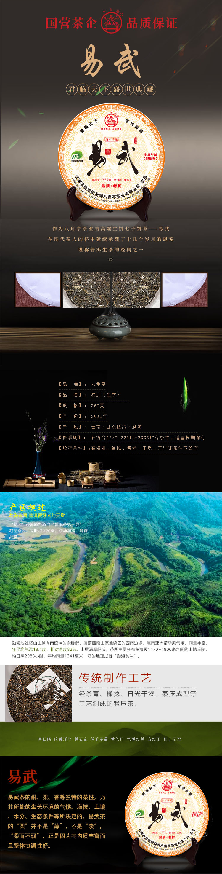 ??——八角亭茶業(yè)公司:經(jīng)營(yíng)方式為生產(chǎn)加工、銷售,主營(yíng)普洱茶、緊壓茶、兼營(yíng)毛茶收購(gòu)。目前以生產(chǎn)、加工、銷售“八角亭”系列普洱茶為主,是云南省農(nóng)業(yè)產(chǎn)業(yè)化龍頭企業(yè)。“八角亭”商標(biāo)獲得云南省著名商標(biāo),“八角亭”牌普洱茶榮獲云南省名牌產(chǎn)品和云南省名牌農(nóng)產(chǎn)品。已先后通過(guò)工業(yè)生產(chǎn)許可證、ISQ9001與HCCP認(rèn)證、云茶牌認(rèn)證(YC)等項(xiàng)工作,在歷次專業(yè)評(píng)比中“八角亭”普洱茶多次獲得特等金獎(jiǎng)和金獎(jiǎng)。2017年5月,“八角亭”牌老班章茶葉獲得了有機(jī)茶資格認(rèn)證。八角亭茶業(yè)公司多次進(jìn)行了技術(shù)改造,現(xiàn)已建立了標(biāo)準(zhǔn)化生產(chǎn)車間和設(shè)備,年設(shè)計(jì)生產(chǎn)量達(dá)3000噸,是整個(gè)公司的主體核心企業(yè)。